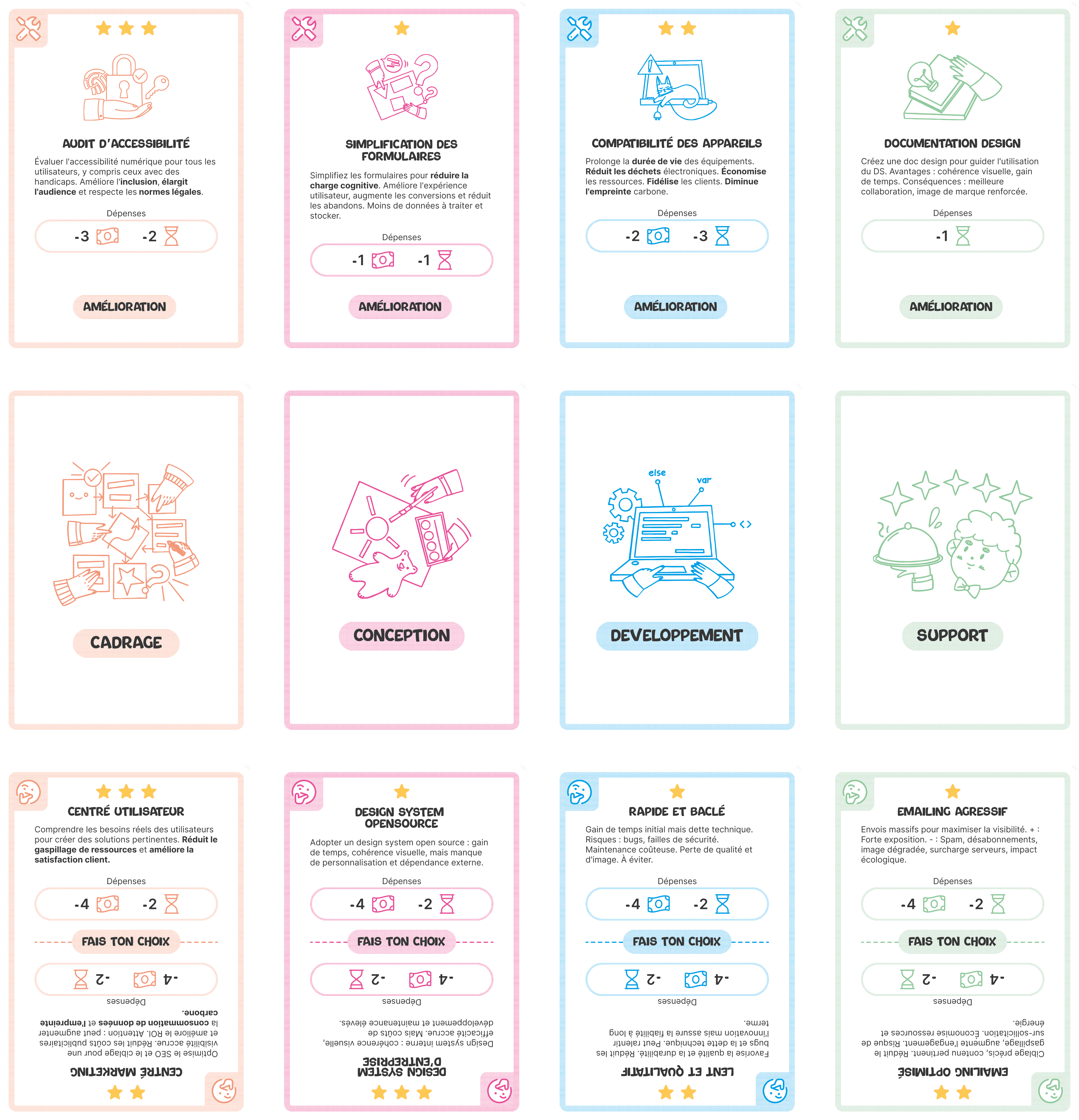 Le jeu avance selon plusieurs phases grâce à la pioche comportera 4 catégories de cartes et représentant les quatre phases principales d'un projet numérique :